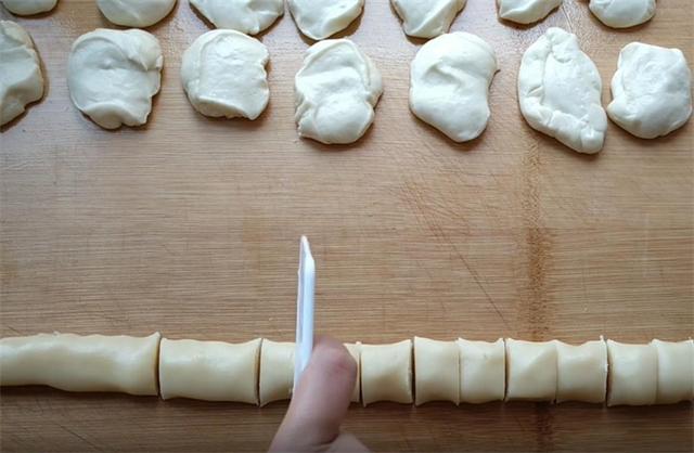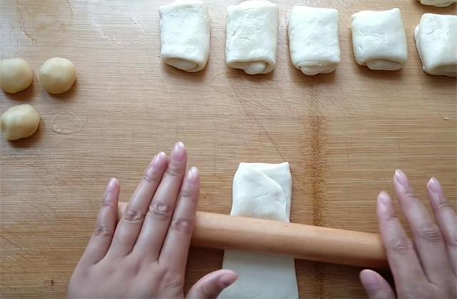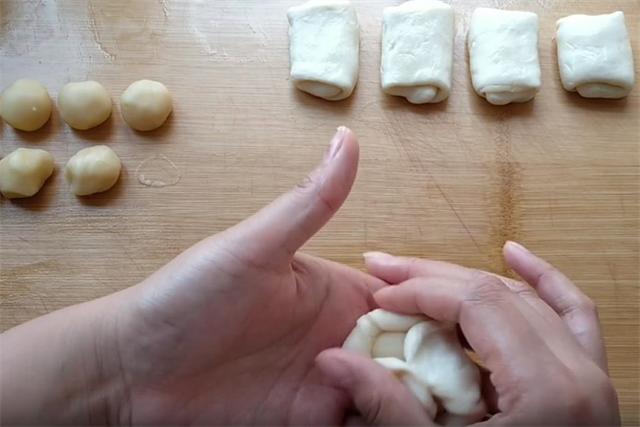5.再把油酥面团搓成长条,下和面皮同等数量的面剂,搓圆备用。