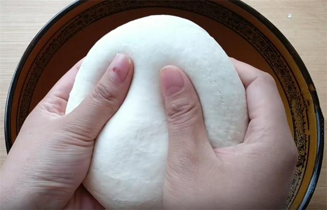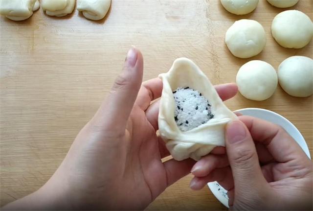 8.接下来我们把先做好的面剂按薄,因为已经松弛好,把它按得越薄,烙制时越容易鼓起,口感也就更酥脆,包入糖馅,然后用包包子的方法收口,虎口转动收紧,这一步是空心的关键,饼不漏气,烙制时才能鼓起,烙出的饼才是空心的。