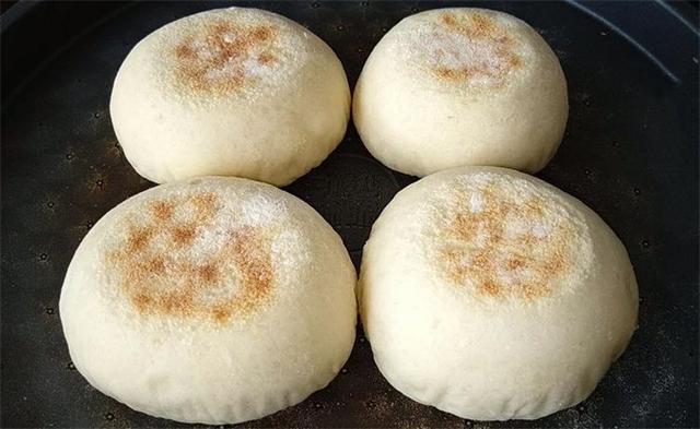 5.这时我们起锅开小火,锅热下入饼坯,烙至底面微黄并鼓起,我们翻面,不用放油,翻过来大约再烙制一分多钟,烙至底面微黄,我们再次翻面,全程小火慢烙,大约烙5到6分钟,甚至更长一些,反复翻面,烙至用手按压快速回弹即可出锅。