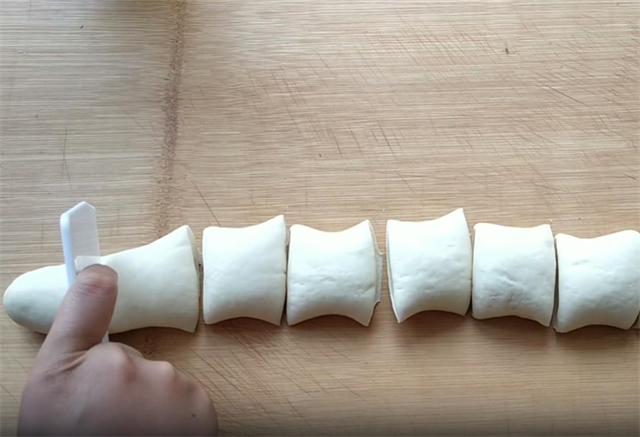 2.面团醒发至原来的两倍大,我们把它放在案板上揉搓排气,一定要多揉一会儿,把里面的气体排净,这样我们二次醒发的时候气孔才会更加细腻,把揉好的面,我们像这样搓成长条,然后下大约8到10个面剂即可。