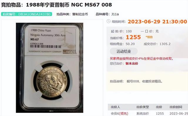 而同样是NGC67分的宁夏币,也有不小的差距,比如在2019年这种品相的宁夏币也就能拍900左右,但现在一枚已经能拍1300上方了,在物以稀为贵的前提下,这种稀少的纪念币已经成为当下最火热的老币之一。