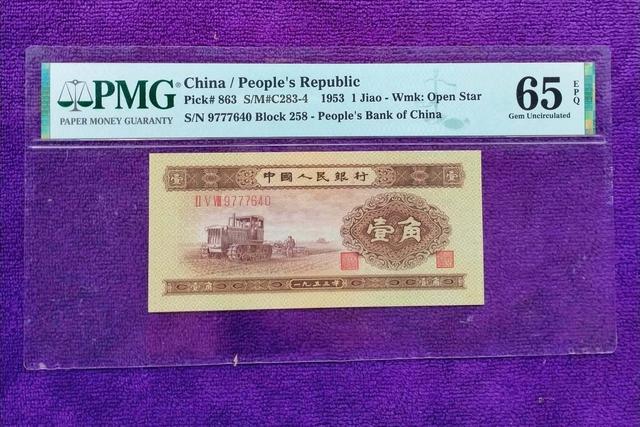 但是图片中这种品相很一般的,它的报价也超过了400,也就是说这种黄一角,无论如何都能涨个几千倍了,注意这种一角在当时也是流通的主力,所以家里能找到的也不少,它的特征也很简单,只要找1953年的一角就行了,你家里还能找到这种一角纸币吗? |