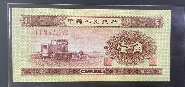 接下来一起来简单的看一看,这里说的黄一角纸币,其实就是1953年的一角纸币,这种一角属于二版币从55年开始发行,到67年就开始回收了,只是它的名气为什么不是很大,因为后续的三版币中,出现了三种罕见的一角,它们的风头完全盖过了黄一角,比如枣红一角和背绿一角。