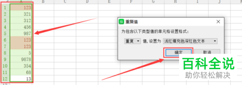 6.设置完成之后我们点击窗口下方的确定按钮,然后表格中的重复数据都会被升红色标记出来,下方就是效果图