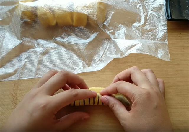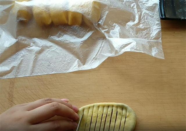 6.然后用刀把上面的一层面皮划开,露出豆沙馅。
