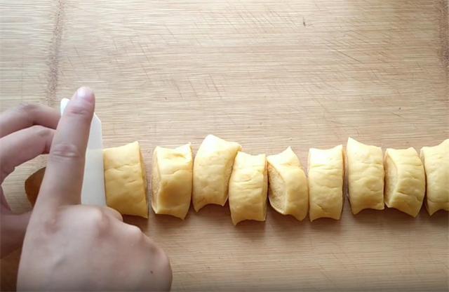 3.大约1个小时左右,我们把发好的面团揉搓排气,多揉一会儿排净里面的气体,这样二次醒发的时候,它的气孔才会特别的均匀,口感才会松软,把揉好的面搓长条,下10到14个稍小一点的面剂,因为我们是用平底锅烤制,稍小一点容易烤熟。