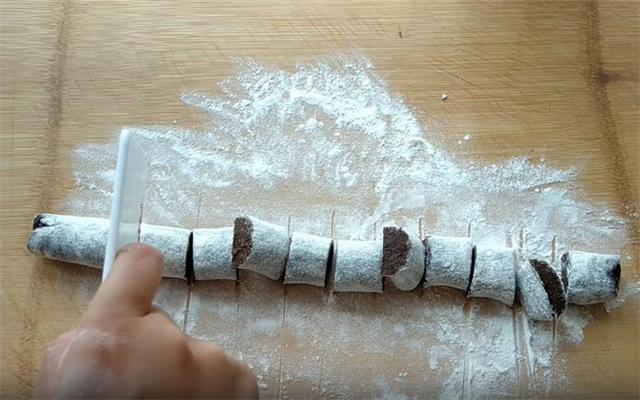 2.接下来我们在案板上放一些干面粉,把买的豆沙馅利用干面粉搓成长条,下成面剂备用。