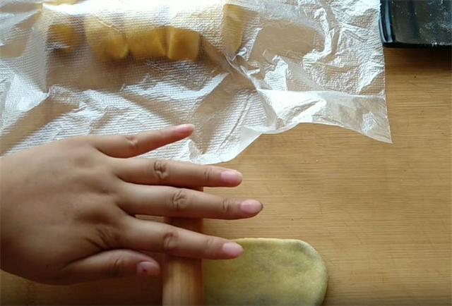 5.放在案板上用擀面杖正反面把它擀至半透明状,一定要注意边缘一定不要擀开,这样豆沙馅容易露出。