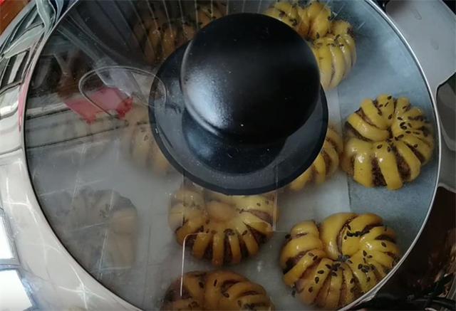 10.醒发至两倍大的时候,我们起锅开小火,大约烙制10到12分钟,电饼铛的话选择薄饼键,如果是用平底锅烙制,一定要用最小火,烙至锅盖上面覆满了大滴的水气,我们关火焖五分钟左右,使内部熟透,时间到我们开盖,松软的豆沙小面包就做好了。