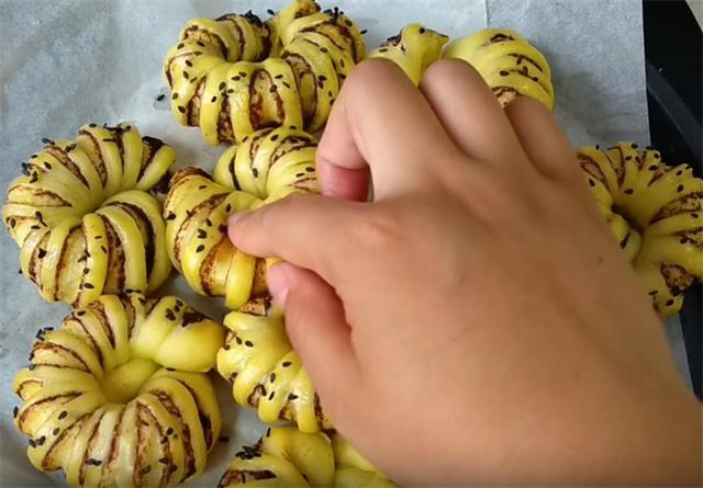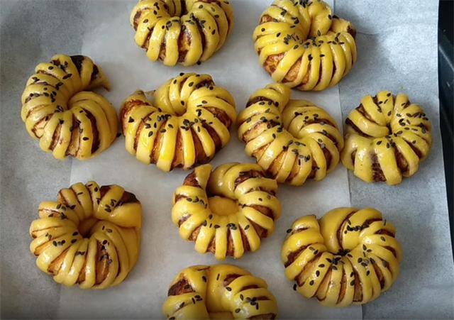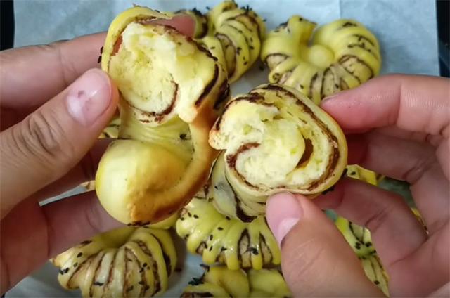 7.然后卷起,这样我们的豆沙小面包就做好了。