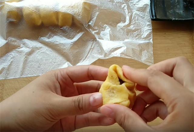 4.把面剂按成中间厚边缘薄一点的面皮,包入豆沙馅,捏合封口。