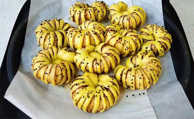 8.面包生坯做好以后,我们准备少许的清水,刷清水能够使面包的表面更加的光亮好看,接下来我们在锅底铺上油纸,防止面包底部烤糊,把做好的面包生坯摆放在油纸上,中间稍微离一点点距离,防止二次醒发的时候互相粘连,在生坯上均匀地刷上一层薄薄的清水,不需要刷得太多,然后利用清水的粘合度,我们撒上一些黑芝麻作为点缀。