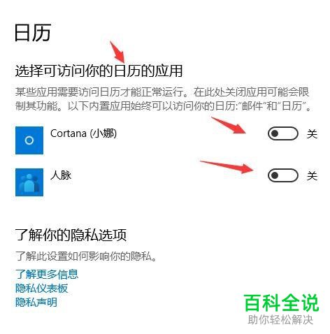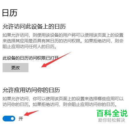 4. 第四步在右侧窗口中,根据下图箭头所指,按照需求开启或关闭日历访问权限。