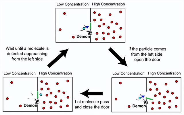 麦克斯韦妖是19世纪由苏格兰物理学家詹姆斯·克拉克·麦克斯韦提出的一个思想实验,用来探讨热力学第二定律的有效性。热力学第二定律简单地说就是熵增原理,也就是说,一个孤立系统的无序程度总是趋向于增加。这个定律告诉我们,自然界中的过程都是不可逆的,比如热量总是从高温物体流向低温物体,而不会反过来。这个定律也告诉我们,我们不能制造一个永动机,一个能够不停地做功而不消耗能量的机器。 那么,麦克斯韦妖又是什么呢?它是一个假想的智能生物,它能够观察和控制一个装有气体分子的容器中的一个小孔。这个小孔可以被打开或关闭,让气体分子通过或阻止。麦克斯韦妖的目的是利用这个小孔来使容器中的气体分子分成两部分,一部分是快速运动的热分子,另一部分是慢速运动的冷分子。麦克斯韦妖似乎违反了热力学第二定律,因为它使得孤立系统的熵减少了。