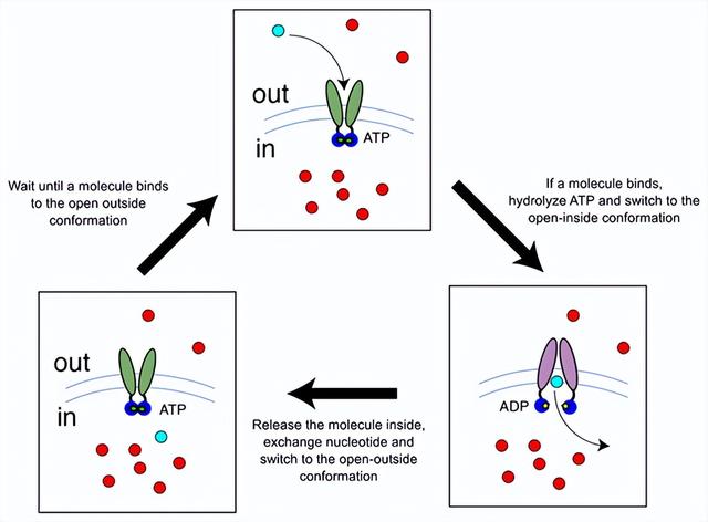当然,我们知道这是不可能的,因为麦克斯韦妖自己也是系统的一部分,它需要消耗能量和信息来观察和控制小孔。如果我们把麦克斯韦妖和容器一起考虑,那么系统的总熵还是会增加,热力学第二定律还是成立的。但是,这个思想实验引发了很多有趣的讨论和研究,关于信息、计算和热力学之间的关系。有些人甚至认为,生命本身就是一种麦克斯韦妖,因为它能够利用能量和信息来维持低熵的有序状态。 今天我要跟大家介绍一种生物分子,它们可以被认为是一种分子级别的麦克斯韦妖。它们叫做ABC转运蛋白(ATP-binding cassette transporters),它们在细胞中起着非常重要的作用,比如吸收营养物质或排出代谢废物。 它们可以利用ATP(三磷酸腺苷)的水解来驱动物质的跨膜运输:它们在细胞膜上形成一个通道,可以让特定的物质通过或阻止。它们可以根据物质在细胞内外的浓度差来选择性地打开或关闭通道,从而维持一个稳定的细胞内外环境的平衡。这些转运蛋白就像是细胞膜上的一个个小门,它们可以根据需要来开或关,让一些物质进入或出去,而不让其他物质通过。