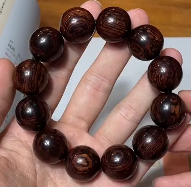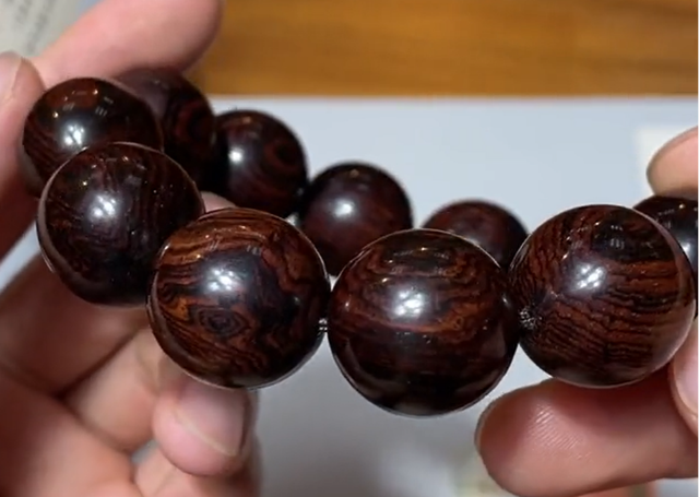 其实这是一条墨西哥花梨佛珠,但是这条满足了大部分玩家,对海黄紫油梨的向往,首先底色是深棕褐色的底色,纹理也是清晰舒展的纹理,再随便给你配个证书就成了很多玩家手里的毕业款了,其实这条还是可以通过图片和视频来区分出来的,就是还是属于一眼假,因为整体看上去很死板很呆滞。