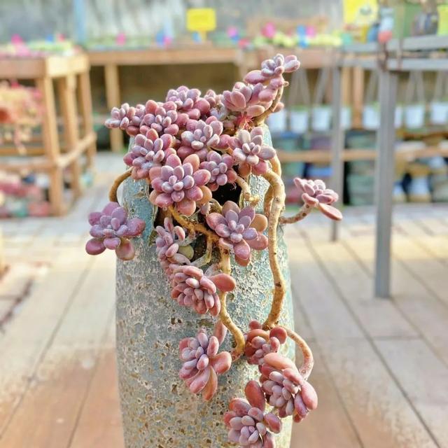 说到比较可爱的多肉植物,果冻乙女心绝对是不错的选择,其圆润可爱的叶子自带果冻色,叶子下部通常呈黄绿色,尖端带点绯红色,看起来宛如少女绯红的脸庞,可爱惹人爱。果冻乙女心虽然比较小巧,枝干也长得有点细,但是可以长成老桩状的,而且长得很坚韧,杆长型美,其叶子比较容易爆盆,如果你家里比较小,建议可以养一盆果冻乙女心。 4.紫乐