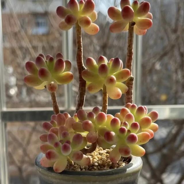 桃蛋又叫桃之卵或醉美人,也是景天科风车草属植物,因为叶片呈卵圆形,叶色偏粉色,看起来宛如成熟的桃子,而得此名,桃蛋的叶子长到一定程度是可以变成粉色、紫色相间的颜色的,叶子表面呈雾状,观赏价值极高,整体给人以可爱的感觉。不过别看桃蛋植株长得小巧,其也是非常容易养成老桩的,即使是在小屋子中养,空间比较狭小,也可以养成小老桩,不过如果能养在更加开阔的环境下,桃蛋植株可以长得株型更好看,叶片也会更饱满。 3.果冻乙女心