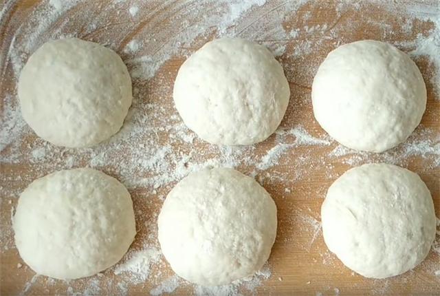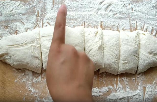 3.然后我们在案板上多撒一些干面粉,把发好的面倒在干面粉上,利用干面粉把面糊整理成长条形,整理好之后,我们下八个左右的面剂。