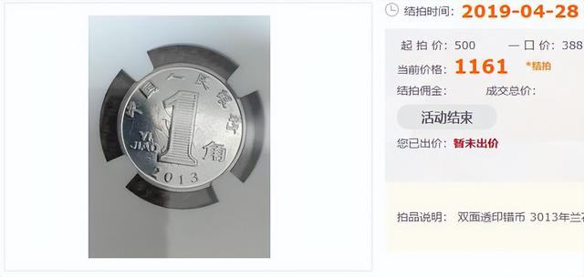 一枚2013年的兰花一角,在拍卖会上竞然拍出了1161,大家要知道兰花一角可是正在流通的硬币,2013年这个年份更是没有任何特殊的地方,很多人家里都有,那么为什么它能涨11000万倍呢?