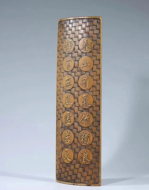品名:清代状元徐郙作竹雕诗文臂搁 规格:高26.5cm 宽8cm 重量:116.8克 说明:这件清代状元徐郙作竹雕诗文臂搁,以质地堅硬、表面油润细腻的竹片雕刻而成,竹片凸面刻诗文:‘春山有气作犹浪,静室无风虚若天’。此竹雕诗文臂搁选材精良、造型典雅、刻竹书法刚劲挺拔、老竹表面长年使用痕迹明显,包浆皮壳渾厚细腻,是难得一见文人书房雅器。全器包浆皮壳细腻、温润如玉,整体气质文雅大方。入手可当写书法之臂搁、书房摆设使用。 徐郙(1836年-1907年),字寿蘅,江苏嘉定人。1861年状元,授修撰。1900年拜协办大学士,官至兵部尚书,左都御史,工诗,善书法。1906年致仕。