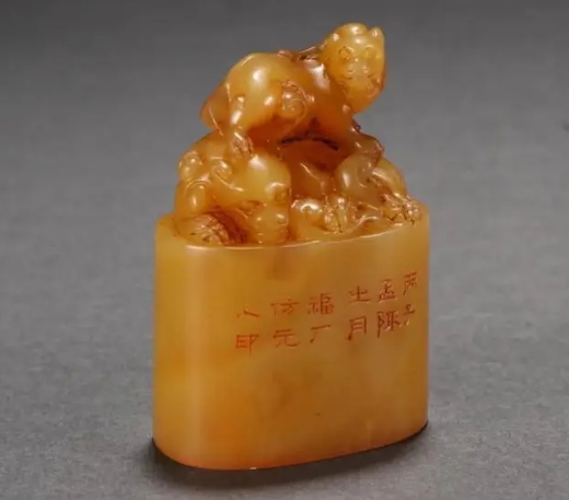 品名:清代名家陈曼生款寿山田黄石山水风景图印章 规格:高7.7厘米,边长3.3厘米 重量:251克 说明:田黄石以其色泽温润可爱,肌理细密,自明清以来就被印人视为“印石之王”。数百年来田黄石极受藏家至爱,正如俗语所说:“黄金易得,田黄难求”。 这枚寿山田黄石山水风景图印章,取寿山田黄石精雕而成,色质柔亮,石纹清晰细腻,包浆柔美。呈四方形,打磨光滑,器身浮雕山水风景图,色泽古雅凝重。边款待考,印文:物常聚于所好。具有较高收藏价值。 陈曼生,(1768-1822),字子恭,号曼生,别称夹谷亭长等。浙江钱塘(今杭州)人,生活在乾隆嘉庆年间。为“西泠八家”之一,擅长古文辞,精于雕琢以书法篆刻成名,其文学、书画、篆刻样样精通,才气过人。