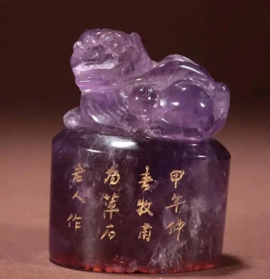 品名:清代金石学家篆刻家黄牧甫刻紫水晶瑞兽钮印章 规格:高6cm 宽4.5cm 重量:163g 说明:这件紫水晶瑞兽钮印章,印成圆形,上雕一瑞兽,边款:甲午仲春牧甫为萍石老人作。印文:明月清风真我友,人生此外何求。紫水晶是一种紫色的灵性水晶,五行学说里紫水晶被认为五行属火,可以“因贵招财”。颜色神秘而艳丽,颇为吸睛,黄牧甫,原名士陵,字牧甫,篆刻“黟山派”开创者。于篆刻一艺,黄氏大胆开拓取法范围,彝鼎、权量、诏版、泉币、镜铭、古陶、砖瓦、石刻等,无不为用,印作饶有鼎彝、镜铭文字趣味,看似平常,实则变化无穷。