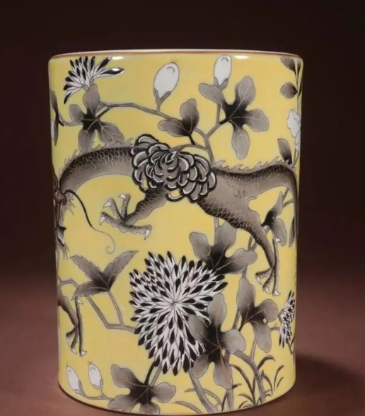 品名:清代大雅斋黄地墨彩祥龙戏花图笔筒 规格:高16cm 宽12.5cm 说明:此藏品端庄周正,圆口,口底相若,圈足。胎质坚实细腻,施釉均匀莹润,釉面光洁莹亮。筒身黄釉为地,釉色黄润明艳,均匀纯净。黄地上绘墨彩祥龙戏花图,绘画生动,龙纹神态威严,身形矫健,趾爪尖利,穿梭于花海之间。周围花朵娇艳盛开,叶脉、花蕊绘制细腻婉转,描写精细生动,色彩悦目。笔筒口沿处题有红彩“大雅斋”铭,“大雅斋”瓷器是慈禧太后专用的御瓷,精工细作,不计工本。 整器绘画饱满,构图疏密有致,釉面均匀润泽,所饰龙纹寓意吉祥,品相甚佳,极富质感,代表当时制瓷的最高水平,值得收藏!