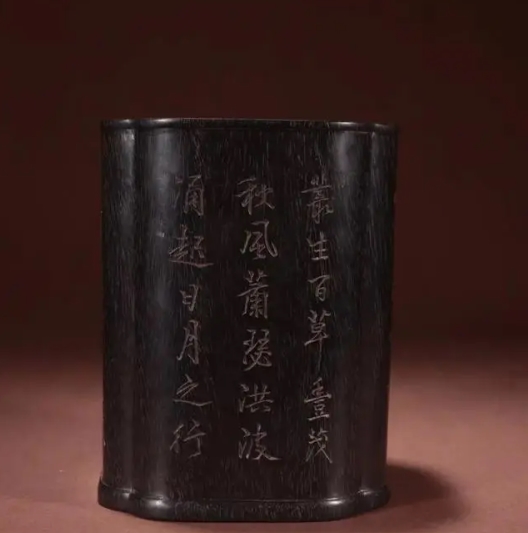 品名:清末民国刻铜名家陈寅生刻小叶紫檀诗文笔筒 规格:高14cm 宽11cm 重量:596g 说明:此笔筒甄选上等小叶紫檀木整料制成,木质油润,质地凝润光泽。形制简约,彰显古时文人追求自然古朴的风雅情怀。笔筒每一面均微凹入,通体曲线优美,做工十分精细,呈现诗文,字体流畅,落款“寅生” 陈寅生(1875—1952),名麟炳,顺天人,清同治秀才,通医学,能书善画,清末民国刻铜名家。在清末至民国时期,被誉为在墨盒上刻文字、图案的第一人。