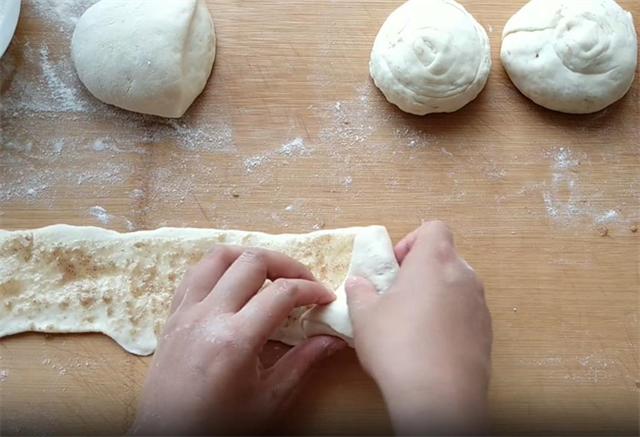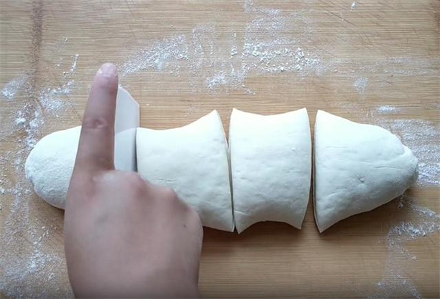 3.在案板上撒上少许的干面粉,把发好的面揉搓排气,大约揉两分钟就可以,然后把它搓成长条,下3到4个面剂,当然你可以做的更大一些,两个也可以。