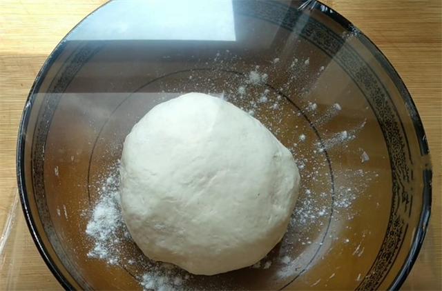 7.接下来我们在案板上撒少许的干面粉,防止粘连,把生坯先用手按扁,再用擀面杖擀成1厘米厚度的圆形面饼。