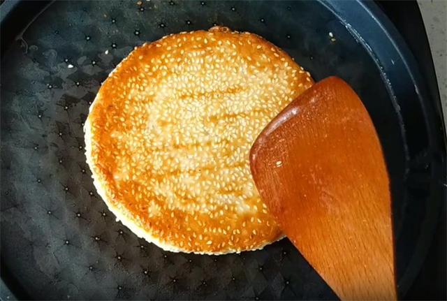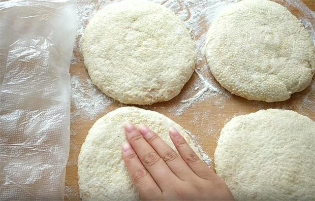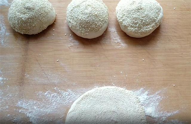8.芝麻一定是在面饼没有擀之前粘好,这样擀制之后芝麻烙制的时候才不会掉落。盖上保鲜膜二次醒发十分钟,醒发至饼明显鼓起,拿起来轻飘飘即可。