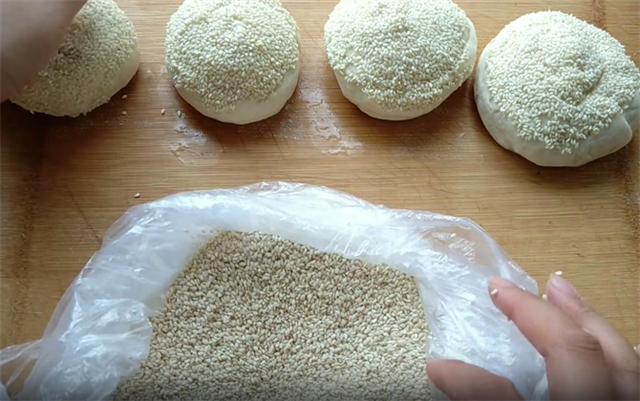 6.最后收尾的时候抻长按压在底部,防止烙制时散开,在做好的生坯上均匀的刷上一层清水,然后蘸上生芝麻。