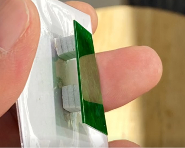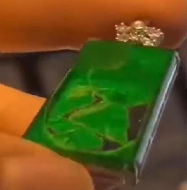 其次看货的时候千万要当心,现在翡翠绿货的镶嵌件,真是让人一言难尽,1毫米都不到那不就是个鸡蛋壳吗?不要说翡翠,就是1毫米的铁片你用手都能个坑,而这种镶嵌件的底托还做的特别厚,给你感觉很厚着实,其实主石很薄很薄。