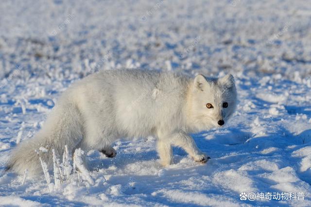 角鹿,亦称驯鹿,是鹿科驯鹿属中唯一的物种。雄性和雌性角鹿都拥有角,这些复杂分叉的角是它们外观上的重要特征。长角分岔繁多,有时甚至超过30个分叉。它们的蹄子宽大,悬蹄发达,尾巴非常短。角鹿身上覆盖着轻便而极寒抵御的毛皮,主要栖息在俄罗斯和中国东北地区。角鹿是鄂温克族少数民族的最佳伙伴,一同构成了极寒地带的美丽景观。它们生活在摄氏零下40度的严寒地区,但即使在摄氏零下60多度的环境中,这种动物也能够存活下来,并没有达到其生存的极限。 7、北极狐(-50℃) 北极狐是一种体长在50-60厘米,尾长约20-25厘米,体重在2.5-4千克左右的动物。它的颜面狭窄,嘴巴尖尖,耳朵呈圆形。北极狐的尾巴毛发蓬松,尾巴末端呈现白色。在冬季,北极狐的全身被覆盖着白色的毛发,只有鼻子的尖端是黑色的;而夏季,它们的体毛呈现灰黑色,腹部颜色较浅。