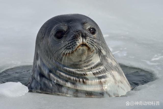 研究表明,王绒鸭具有惊人的耐寒能力,可以承受低至零下-110℃的极端温度。这归功于它们浓密的羽毛,而在羽毛之下还有一层细小的绒毛,就像一层毛毯包裹在北极鸭的身体周围,起到保暖的作用,使它们能够抵御严寒的环境。 3、海豹(-100℃) 海豹是指鳍足亚目下属海豹科动物的总称。它们的身体形状粗圆,呈纺锤形,全身覆盖着短毛,背部呈现蓝灰色,腹部呈乳黄色,并带有蓝黑色的斑点。海豹的头部近似圆形,眼睛大而圆,没有外耳廓,吻部短而宽,上唇上长有坚硬粗厚的触须,形状类似念珠。海豹主要栖息于寒温带的海洋中,在除了产仔、休息和换毛季节之外的时间里,它们会在海中游泳、觅食或者嬉戏,只有在这些季节才会上岸到冰上、沙滩或者岩礁上。