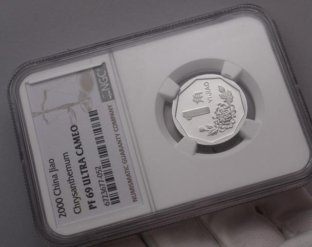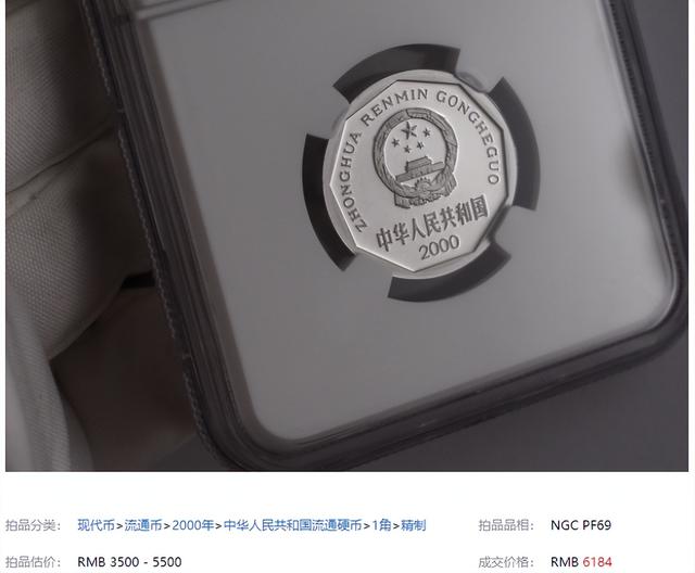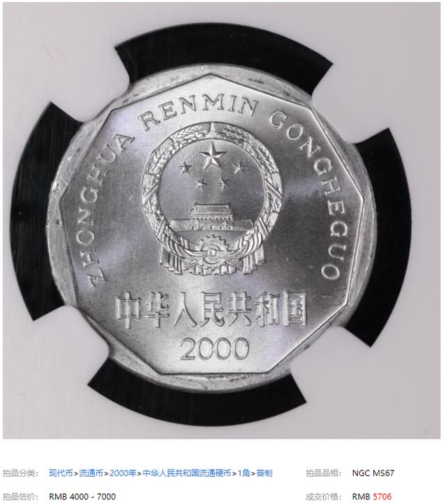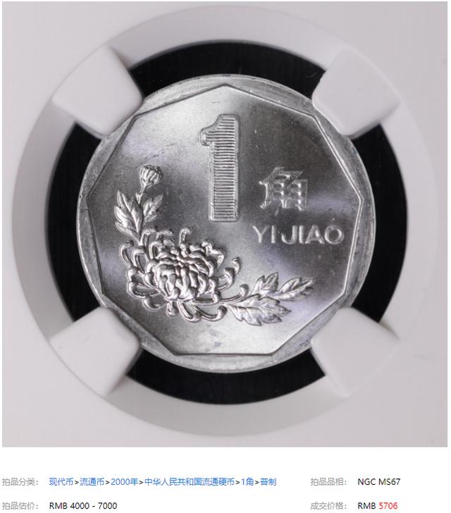 在今年的4月,就有一枚00年的菊花1角在拍卖会上亮相,最终拍出5706! 需要注意的是,它是NGC67分的亚军分评级币,能达到相同评分的只有307枚,更高分的冠军分更是只有1枚而已。 2000年的精制币上文也有提到,菊花1角一般每年还有2万枚精制币发行。 2000年也不例外。这个年份也由于没有进入流通的原因,更受追捧。