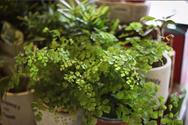 比如说,像家里的卫生间就很对铁线蕨的胃口,温暖,潮湿,通风,还有不错的散射光。关键是铁线蕨能吸收空气中的异味,它和卫生间真的算得上是“珠联璧合”了。当然了,它能摆放在任意没有直射光的环境里,像客厅的茶几之上,卧室的床头,书房的窗台等等,主要保证有湿润的环境,就能一直苍翠如碧玉,如果有一台加湿器,你就能常年都看到高颜值的铁线蕨了。