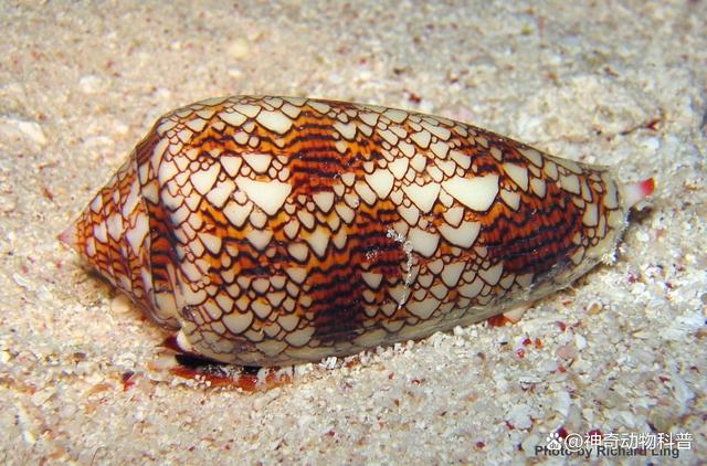 蓝环章鱼,又被俗称为蓝圈章鱼或豹纹章鱼,属于章鱼科中的蓝环章鱼属。它因身体上明亮的蓝色环纹而得名,是已知毒性最猛烈的剧毒海洋生物之一。蓝环章鱼是一种体型很小的章鱼品种,臂展不超过15厘米,整个身体只有高尔夫球大小。尽管蓝环章鱼的体型相对较小但它携带的毒素足以在数分钟内毒杀26名成年人,目前还没有有效的抗毒素来对抗它的毒性。幸运的是,这种章鱼并不主动攻击人类,除非它们受到极大威胁。 4、鸡心螺(学名:Conus geographus)