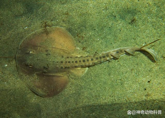 僧帽水母又称葡萄牙战舰,据说其能预知风暴。它有个浮囊,下面垂着一条条长触手。囊内有种特别的腺,可以发出二氧化碳,使它膨胀。水母,希腊文的意思是“气泡”,正是在这种“气泡”的帮助下,能升高,会降低,使水母漂到有食物的地方,或者远离敌害。僧帽水母的**武器是它的触手,僧帽水母的细小触手能够达到9米之长,所以很多游泳者在看到僧帽水母的时候再躲避已经迟了。僧帽水母所分泌的毒素属于神经毒素,随着时间的推移,伤者除了遭受剧痛之外还会出现血压骤降,呼吸困难,神志逐渐丧失,全身休克,最后因肺循环衰竭而死亡。 8、刺鳐(学名:Platyrhinoidis Triseriata)