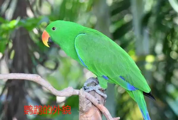 鹦鹉的外貌是白色的眼睛中间有一双灵活透明的眼睛,还有一个红色的小嘴,爪子是灰色的,围绕着笼子的墙壁行走,头上有一簇毛茸茸的毛,像一顶绿色的帽子,更像美丽的凤头,黄色的脖子,蓝色的翅膀,背部和胸部像大桃子,里面是白色红色的,尾巴是扁平的,全身毛茸茸的,腹部薄而柔软,有鹅黄和浅绿色的皮毛,颜色从腹部到背部逐渐变化,逐渐变成绿色、深绿色和深绿色。