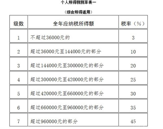 3、稿酬所得 个人因作品以图书、报刊形式出版,发表而取得的所得,按照稿酬所得缴纳个人所得税,按照收入减除20%的费用后的余额作为收入额,再按照收入额的70%确认应纳税所得额,税率为20%。具体计算公式为:应纳税额=收入×(1-20%)×70%×20%。 4、特许权使用费所得(www.ws46.com) 个人提供专利权、商标权、著作权以及其他特许权的使用权取得的所得,按照特许权使用费所得缴纳个人所得税。特许权使用费所得按照收入减去20%的费用后的余额确认为应纳税所得额,税率为20%。具体计算公式为:应纳税额=收入×(1-20%)×20%。 上面四项所得,均需要并入综合所得,进行汇算清缴,综合所得税率表如下,如果上面四项所得,预缴的个税合计数大于按照综合所得计算的个税,多预缴的个税,就可以申请退税。