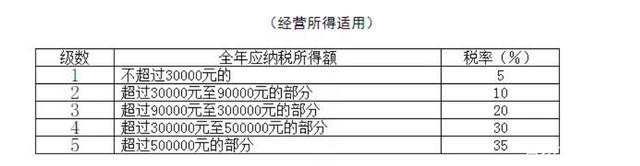 5、经营所得 个体工商户、个人独资企业、合伙企业的个人投资者以及从事生产经营的个人取得所得,按照生产经营缴纳个人所得税。具体税率为5级超额累进税率,以每年收入减除相关合法成本费用后的余额为应纳税所得额。应纳税额=应纳税所得额×适用税率(5%——35%)。