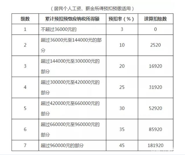1、工资薪金所得 工资薪金所得即为基于个人在单位任职受雇而取得的工资、奖金、年终加薪、津贴补贴等所得。针对工资薪金所得采取的是累计预扣预缴法每月进行预扣预缴,次年进行汇算清缴。某月预扣预缴个税=(累计收入-累计基础费用-累计专项扣除(三险一金等)-累计专项附加扣除-累计其他法定扣除项目)×预扣预缴率-速算扣除数 具体税率为应纳税所得额不超过36000元的,预扣率为3%;超过36000元不超过144000元的部分,预扣率为10%;超过144000元,不超过300000元的部分,预扣率为20%;超过300000元,不超过420000的部分,预扣率为25%;超过420000元不超过660000元的部分,预扣率为30%;超过660000元不超过960000元的部分,预扣率为35%;超过960000元的部分预扣率为45%。