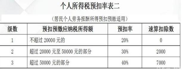 2、劳务报酬所得 劳务报酬所得实行按次预缴,次年并入综合所得进行汇算清缴。收入不超过4000元,减除费用为800,超过4000元的,减除20%作为预扣预缴应纳税所得额。预扣预缴应纳税额=应纳税所得额×预扣率-速算扣除数。预缴税率具体为:预扣预缴应纳税所得额不超过20000元的,预扣率为20%;超过20000元不超过50000元的部分,预扣率为30%;超过50000元的部分预扣率为40%。