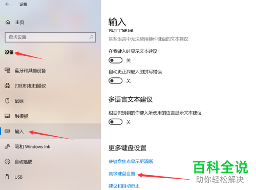 4. 若是想要隐藏桌面语言栏,则需要依次点击开始---设置---输入---高级键盘设置选项.