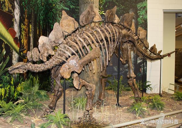 剑龙骨骼,位于卡内基自然历史博物馆 剑龙是一种巨大的食草性恐龙,生活在侏罗纪晚期。它们的身长大约在7-9米之间,高度在2.35米至3.5米之间,体重约为2至4吨。剑龙的背部有一排巨大的骨质板,以及带有四根尖刺的危险尾巴,这些特征使它们能够有效地防御掠食者的攻击。剑龙通常栖息在平原上,并以群体游牧的方式生活。它们与其他食草动物如梁龙等共同生活,形成一个相对稳定的生态系统。剑龙的背部是其最显著的特征之一,由17块分离的平板构成。这些板状结构是一种高度特化的骨层,与现今鳄鱼和蜥蜴身上的一些构造相似。
