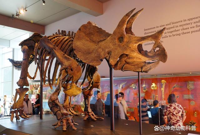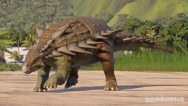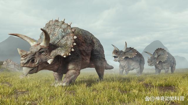 背甲龙 背甲龙是一种体长可达10米的恐龙,它的体宽较大,颈部相对较短。四肢粗短而强壮,脚部短而宽,前脚有5个指头,后脚有4个趾头,指(趾)末端有蹄状的爪子,适合在陆地上活动。当遇到敌害时,背甲龙可以将爪子插入土中,以避免身体被翻倒,保护其柔软的腹部;同时,它还可以利用发达的尾锤进行反击。背甲龙通常被认为是装甲恐龙的起源。它的特点是全身覆盖着甲壳,并且拥有巨大的椎尾。然而,背甲龙是甲龙属中最大的一种。与现代陆地动物相比,背甲龙的体型显得特别庞大。 4、三角龙