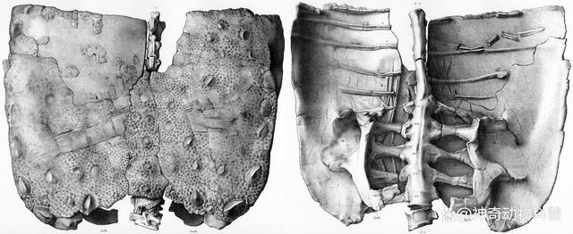 双腔龙的复原图 易碎双腔龙是由古生物学家爱德华·德林克·科普(Edward Drinker Cope)雇佣的化石收藏家Oramel Lucas在1877年在美国科罗拉多州的卡农城北部花园公园挖掘出来的。Lucas在挖掘圆顶龙的矿场时发现了易碎双腔龙的部分脊椎,包括神经弓和神经棘。易碎双腔龙无疑是历史上最长、最重的恐龙,甚至比蓝鲸还要大。它的身长可达35米,与梁龙有近亲关系。目前,科学家普遍认为,易碎双腔龙的最大个体可能达到60至80米长,臀部高度可达10米,头部高度可达14至15米,体重最重可达220吨。 3、背甲龙