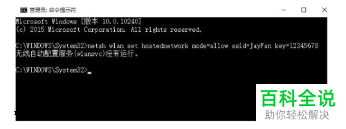 2. 在打开的命令提示符窗口下,输入:netsh wlan set hostednetwork mode=allow ssid=JayFan key=12345678,回车。(我们可以将上面的命令直接粘贴到命令提示符中)